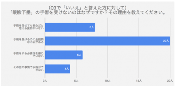 眼瞼下垂と診断されながらも手術を受けなかった38名に対し、その理由を尋ねたところ、手術を断念する最大の理由は「金銭的な不安」が最も多い回答となりました。